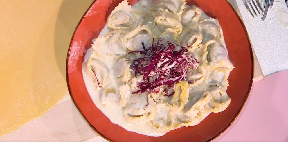 Tiriamo la sfoglia sottile e ritagliamo dei quadrati. Su ognuno mettiamo una noce di ripieno. Richiudiamo a triangolo, quindi diamo la forma dei tortelloni, congiungendo le estremità. Cuociamo i tortelloni in acqua bollente e salata, quindi li scoliamo e li saltiamo con la salsa al formaggio.