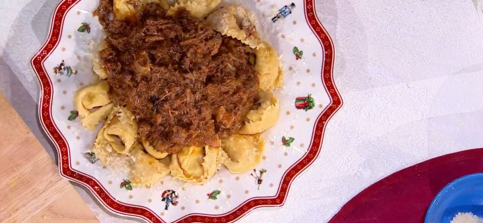 Lessiamo i tortelli per un paio di minuti. Li scoliamo e li saltiamo con il sugo di ossibuchi.