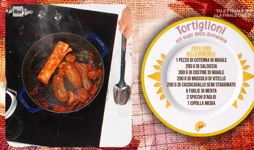 - 500 g tortiglioni, 1 pezzo di cotenna di maiale, 200 g salsiccia, 300 g costine di maiale, 200 g muscolo di vitello, 200 g caciocavallo semi stagionato, 6 foglie di menta, 2 spicchi d’aglio, 1 cipolla media, 1 foglia di alloro, 1 bicchiere vino rosso, 50 g concentrato di pomodoro, 1,5 kg salsa di pomodoro, olio evo, noce moscata, chiodi di garofano, cannella, sale e pepe