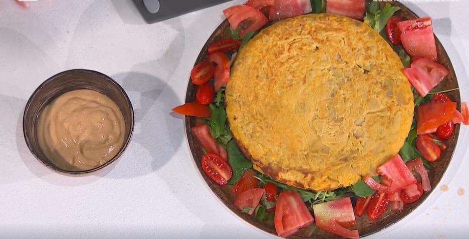 Scaldiamo una padella con un generoso filo d’olio. Versiamo all’interno il composto di uova, patate e cipolla, copriamo e lasciamo cuocere dolcemente. Quando si rassoda, la giriamo e finiamo di cuocere. Serviamo con un’insalatina di misticanza e pomodori.