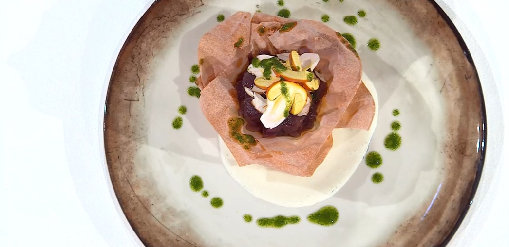 Riempiamo il cestino di pasta fillo con la cipolla stufata e ancora calda, quindi adagiamo sopra il fungo crudo affettato. Lo posizioniamo su uno specchio di crema di formaggio di capra e finiamo con prezzemolo tritato o frullato.