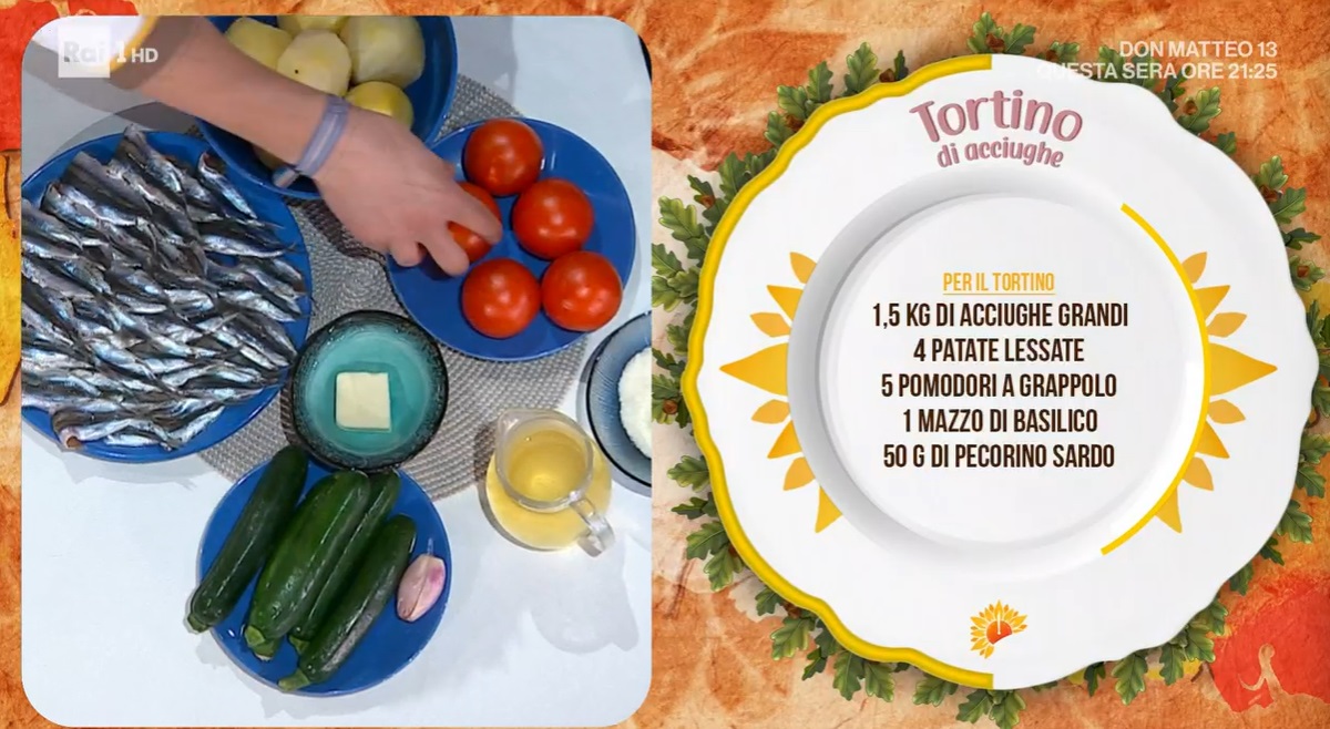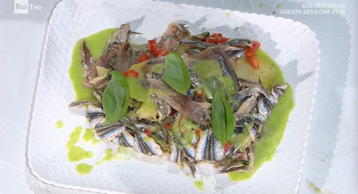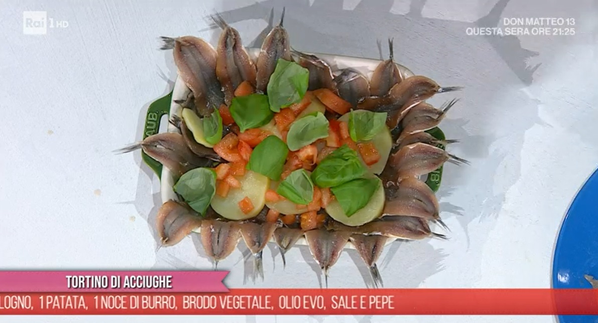 Ungiamo con abbondante olio una pirofila, quindi disponiamo i filetti di acciughe alla base e sui bordi. Formiamo sopra uno strato di patate lesse a fette, un po’ di pomodoro crudo a dadini, basilico fresco e copriamo con altri filetti di acciughe. Ripieghiamo le acciughe sui bordi verso l’interno e distribuiamo in superficie altro pomodoro, pecorino grattugiato, sale, pepe, olio e mettiamo in forno caldo a 180° per 10 minuti.