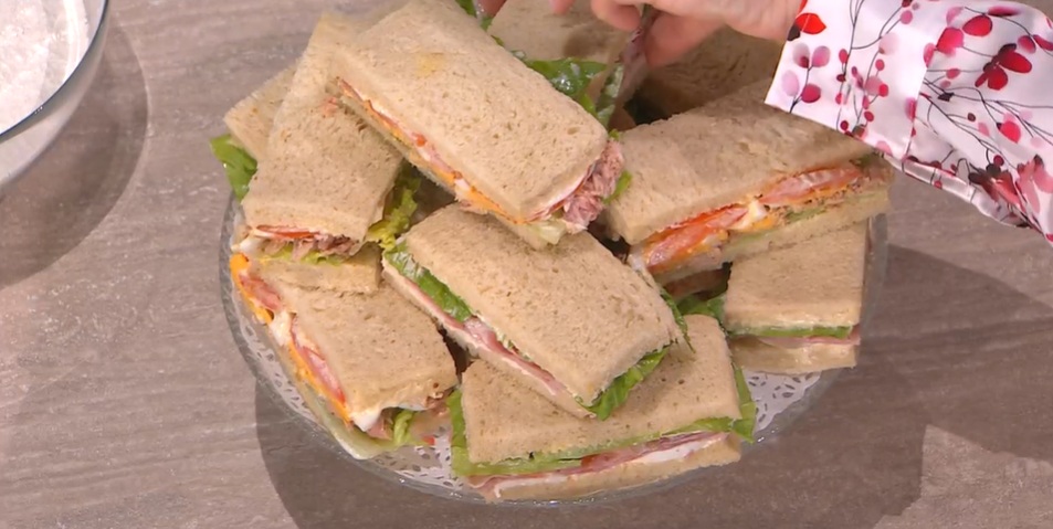 Farciamo le fette di pane in due modi: velo di maionese sul pane, lattuga, pomodoro tagliato sottile, tonno sott’olio sbriciolato, uova sode a fette e chiudiamo.