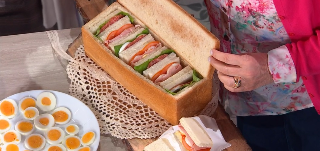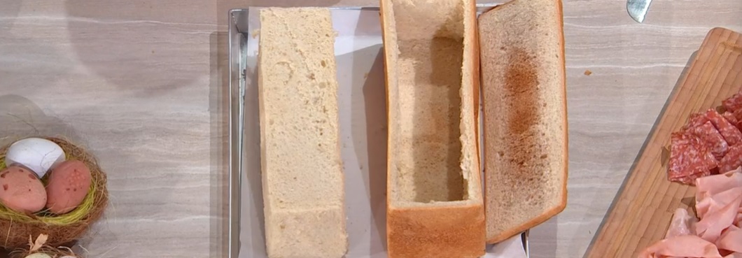 Quando il pane è freddo, con un coltello, tagliamo la calotta superiore e la base e preleviamo la mollica: otterremo un lingotto di mollica. Tagliamo quest’ultimo a fette e farciamo ciascun tramettino con gli ingredienti sopra indicati, a piacere. Inseriamo i tramezzini farciti all’interno del contenitore di pane (la crosta).