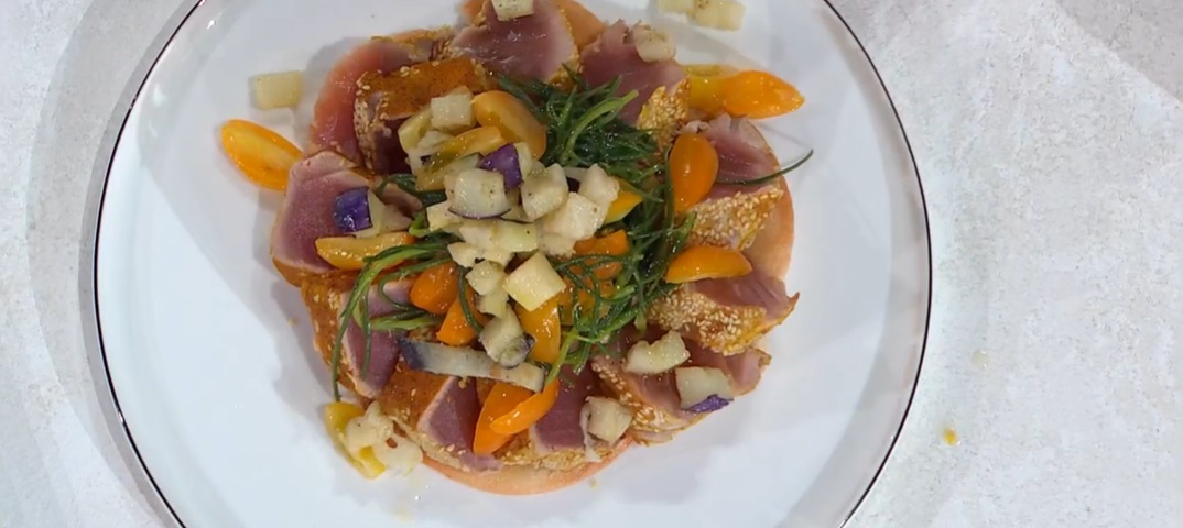 - 1 trancio di tonno, 1 melanzana, 50 g agretti, 200 g pomodorini gialli, 1 galletta del marinaio, succo di 1 arancia, scorza di 1 limone, 1 spicchio d’aglio, semi di sesamo, curry, origano, olio di semi, olio evo, sale e pepe
