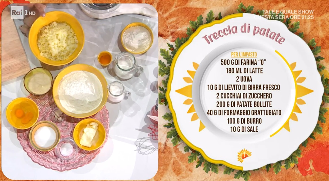 - 500 g farina 0, 180 ml latte, 2 uova, 10 g lievito di birra fresco, 2 cucchiai di zucchero, 200 g patate bollite, 40 g formaggio grattugiato, 100 g burro, 10 g sale