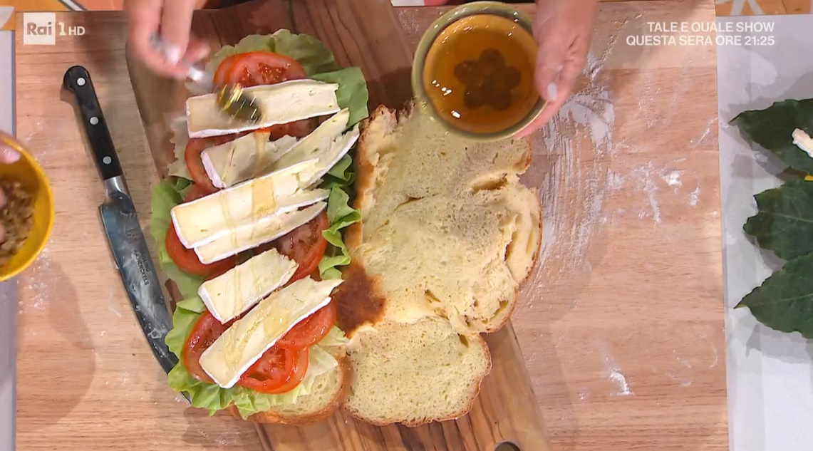 Romana la taglia a metà e la farcisce con lattuga, pomodori a fettine, brie a fettine, noci ed un filo di miele.