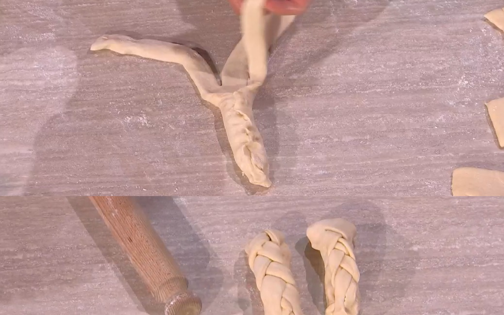 Assottigliamo con il mattarello ogni rettangolo e mettiamo su una metà del formaggio filante tritato (scamorza, mozzarella per pizza). Richiudiamo l’impasto sul ripieno; la metà senza ripieno, la dividiamo in tre striscioline, che intrecciamo; ripieghiamo la treccia ottenuta sulla parte col ripieno, facendola aderire (foto).