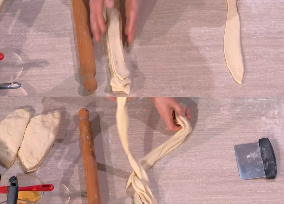Prendiamo una parte e la stendiamo con il mattarello, formando un rettangolo spesso mezzo cm. Lo dividiamo in 6 strisce uguali, che mettiamo una sopra l’altra. Dividiamo il salsicciotto ottenuto a metà, per il lungo. Intrecciamo le due metà e le posizioniamo sulla placca con carta forno. Possiamo fare singole trecce o inserirne tre all’interno di una teglia, distanziate. Copriamo e lasciamo lievitare fino al raddoppio.