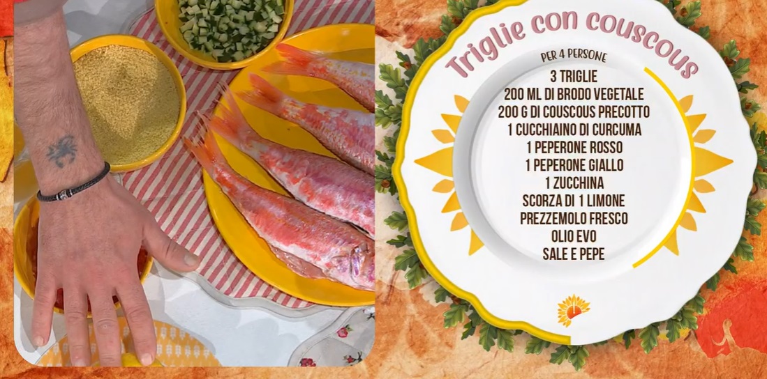 - 3 triglie, 200 ml brodo vegetale, 200 g cous cous precotto, 1 cucchiaino di curcuma, 1 peperone rosso, 1 peperone giallo, 1 zucchina, scorza di limone, prezzemolo, olio evo, sale e pepe