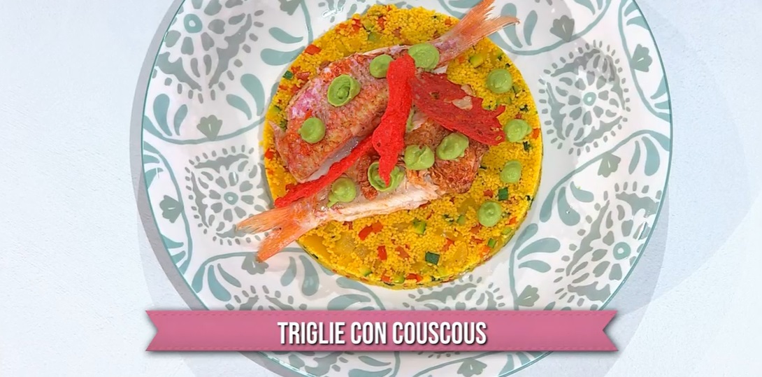 Serviamo le triglie su un letto di cous cous. Completiamo con la salsa di piselli ed il corallo.