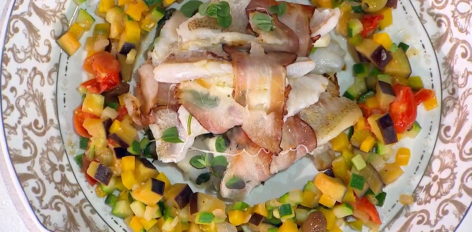 Disponiamo sul piano le fettine di pancetta. Su ognuna, adagiamo un filetto di triglia in perpendicolare. Saliamo e posizioniamo su ogni triglia una foglia di basilico, una fetta di provola, quindi chiudiamo con un altro filetto di triglia ed arrotoliamo il tutto nella fettina di pancetta.