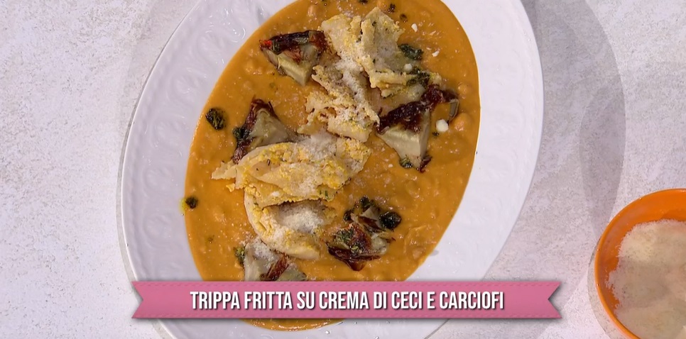 Gian Piero Fava apre questa settimana carnevalesca con un ‘classicone’ della cucina romana, un piatto amato e/o odiato da molti. Vediamo come preparare la trippa fritta su crema di ceci e carciofi.