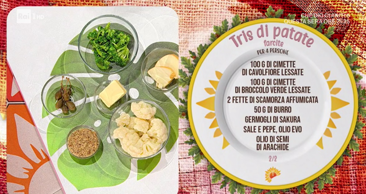 - 3 patate di media misura, 100 g salsiccia luganega, 50 g pesto, 100 g carne macinata, 10 g capperi, 6 capperi in fiore, 6 cucchiai di senape, 100 g cimette di cavolfiore lessate, 100 g cimette di broccolo verde lessate, 2 fette di scamorza affumicata, 50 g burro, sakura, sale e pepe, olio evo, olio per friggere