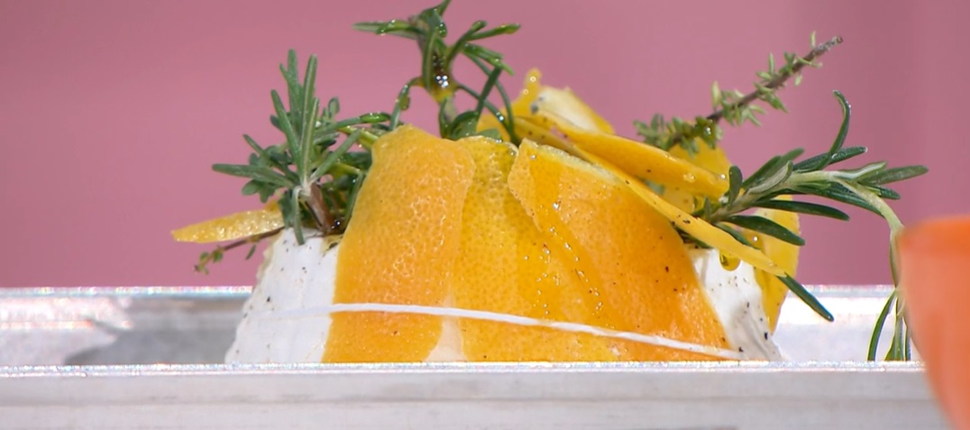 Per la ricotta, con un pelapatate, ricaviamo la parte colorata della scorza di arancia e limone. Posizioniamo su una teglia con carta forno la ricottina e la condiamo con sale, pepe, quindi infilziamo la ricotta con lo spicchio d’aglio e le erbe aromatiche. La copriamo con le scorza degli agrumi preparate, leghiamo le scorzette intorno con uno spago, irroriamo con l’olio, spolveriamo con cannella se gradita e mettiamo in forno caldo e statico a 120° per 1 ora.