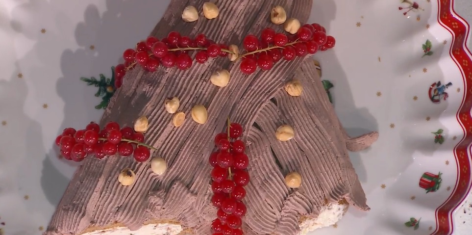 Spalmiamo la panna al cacao sul tronchetto (oppure usiamo una sacca da pasticcere) e decoriamo a piacere con nocciole e ribes.