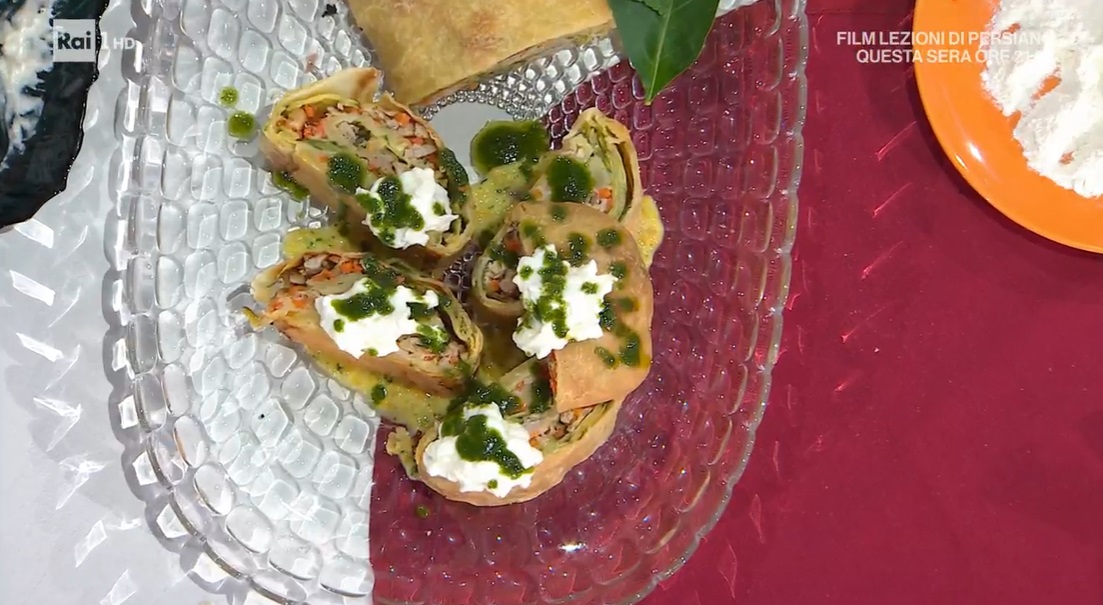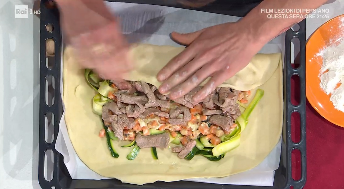 Con il mattarello stendiamo la pasta matta, in modo da ottenere un rettangolo sottile (3-4 mm) della grandezza di una placca da forno. La posizioniamo su un foglio di carta, quindi sulla placca del forno. Distribuiamo sul rettangolo di pasta le zucchine crude marinate, il composto di carote e stracciatella, quindi la carne rosolata. Ripieghiamo l’impasto sul ripieno, come fosse uno strudel. Spennelliamo con l’olio e cuociamo in forno caldo a 180° per 30 minuti o fino a doratura.