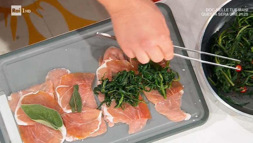 - 800 g carne di vitella, salvia, 12 fette di prosciutto gambuccio, 12 fette di pancetta tesa affumicata, 500 g cicoria, 150 g burro, 1 peperoncino, sale, pepe, olio evo