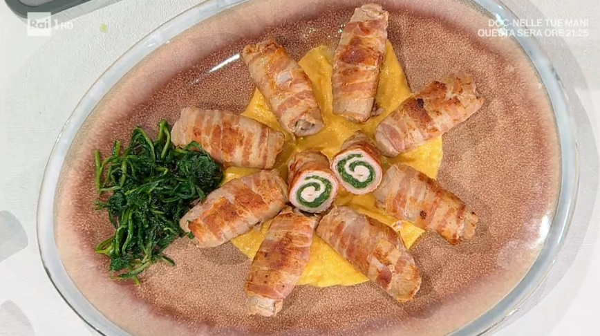 Serviamo gli involtini su una base di salsa cheddar.