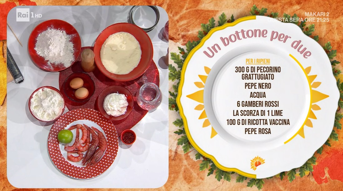 Ricaviamo dei dischetti di sfoglia e su ognuno, mettiamo il ripieno cacio e pepe su metà e quello ai gamberi sull’altra metà. Sovrapponiamo un secondi disco di sfoglia e sigilliamo bene i bordi, tenendo separati i due ripieni (premiamo al centro con uno spiedino). Cuociamo i bottoni in acqua bollente e salata per il tempo necessario. Li scoliamo e li saltiamo in padella con il condimento.