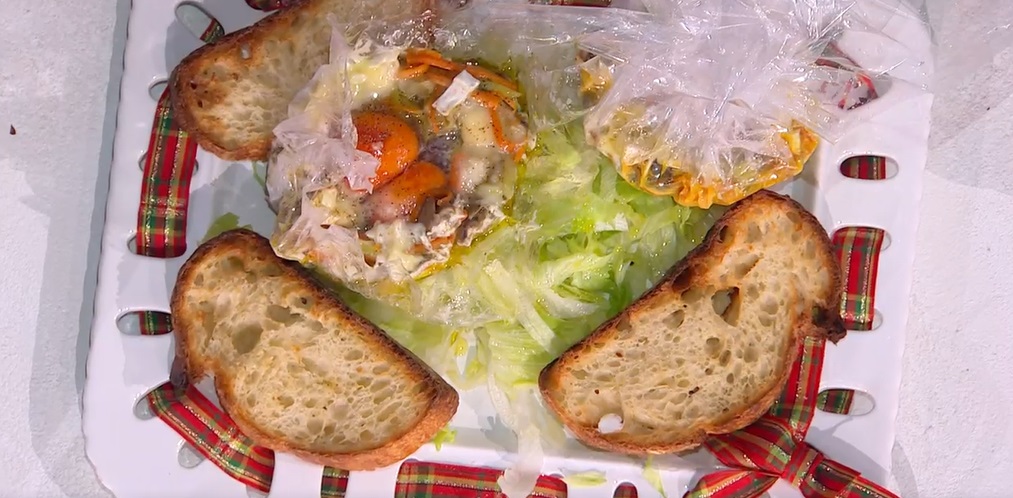 Li spacchettiamo e serviamo su un letto di insalata verde con delle fette di pane abbrustolito.