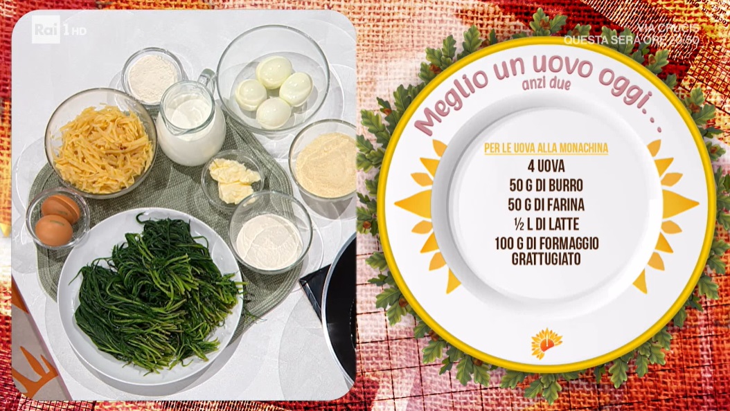 • Uova alla monachina: 4 uova, 50 g burro, 50 g farina, mezzo l latte, 100 g formaggio grattugiato