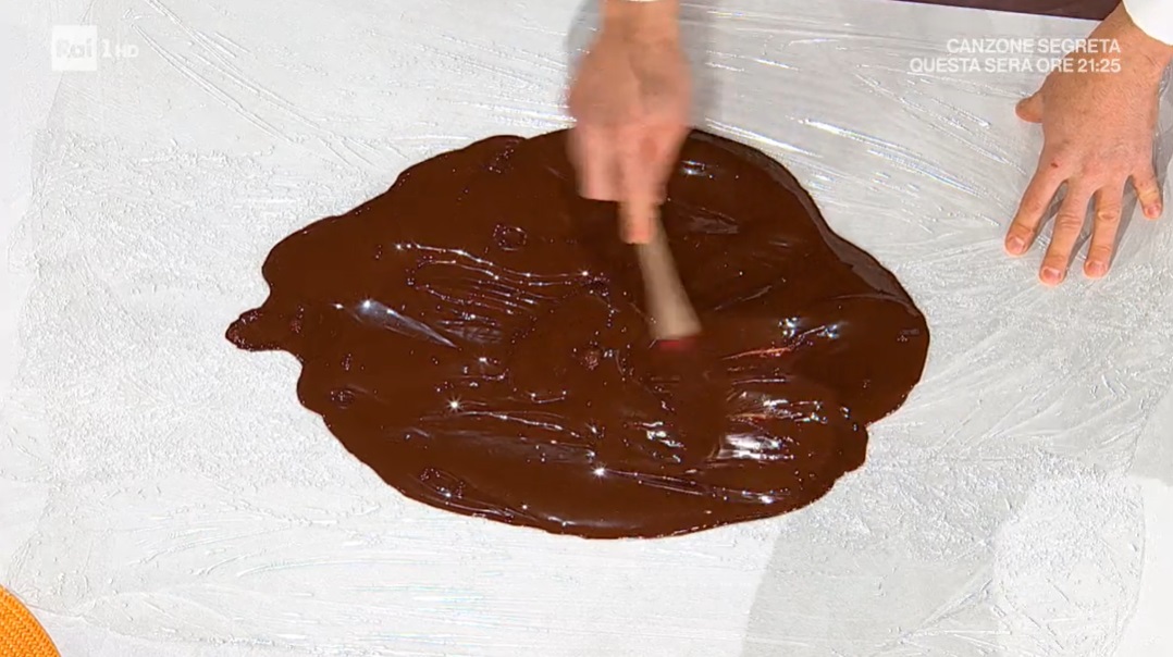 Un secondo modo è quello di inumidire il piano di lavoro, far aderire della pellicola alimentare, in modo da foderarlo, e colare sopra il cioccolato fondente a 50°, tenendone da parte un po’. Cominciamo a muovere il cioccolato con la spatola, sul piano, in modo da raffreddarlo. Quando il cioccolato è a 29°, lo raccogliamo piegando la pellicola su se stessa e lo rimettiamo nella ciotola con il cioccolato tenuto da parte e ancora caldo (torneremo a 31°). Mescoliamo nuovamente con la spatola per pochi istanti.