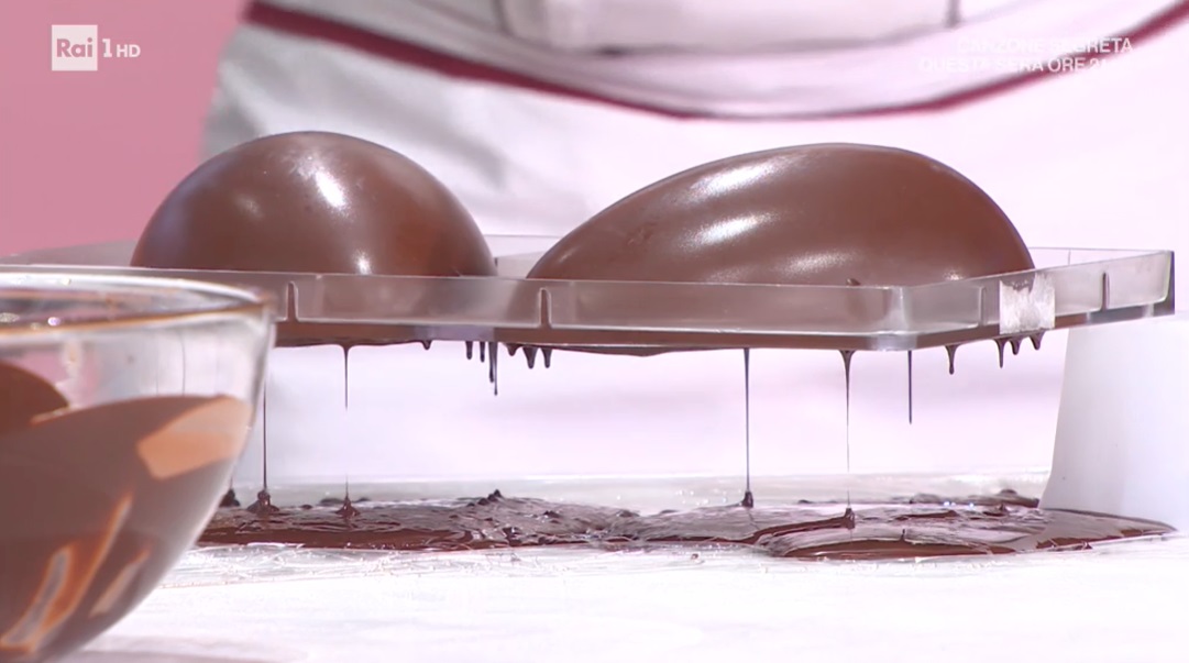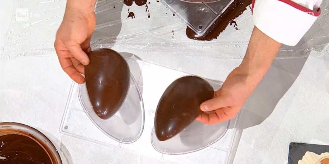 A questo punto, coliamo il cioccolato nello stampo per uovo e roteiamo in modo da coprire per bene lo stampo. Lo capovolgiamo sul piano foderato con della pellicola pulita e lasciamo raffreddare in questa posizione per 4-5 minuti. A questo punto, con una spatola, raschiamo un po’ di bordi, in modo da eliminare eventuali irregolarità. Mettiamo in frigorifero per 5 minuti, poi tiriamo nuovamente fuori e lasciamo asciugare a temperatura ambiente: quando il cioccolato sarà freddo, si staccherà dallo stampo da solo.