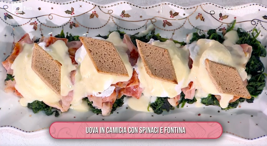 L’aria del Natale aleggia oramai nel bosco di Rai1. Ne ha sentore anche Francesca Marsetti, che firma la ricetta del mezzogiorno, la stessa che una telespettatrice ha dovuto indovinare tra tre opzioni. La cuoca bergamasca prepara uova in camicia con spinaci e fontina.