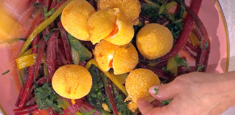 Ad aprire la puntata è Barbara De Nigris, che propone un secondo piatto vegetariano, un modo inedito di proporre le uova sode. Vediamo come preparare le uova in crosta con bieta all’agro.