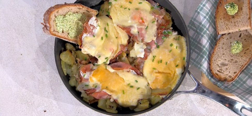 Su una padella ben calda, mettiamo a rosolare lo speck affettato con una noce di burro, creando come dei nidi. Su ogni fetta di speck, rompiamo un uovo. Saliamo, copriamo (facendo uscire il vapore) e portiamo a cottura le uova. Su ogni uovo cotto, quindi, mettiamo il formaggio stanga fuso. Infine, posizioniamo ogni porzione di speck, uova e formaggio sulle patate dorate in padella. Accompagniamo con dei crostoni di pane spalmati con il burro aromatizzato.
