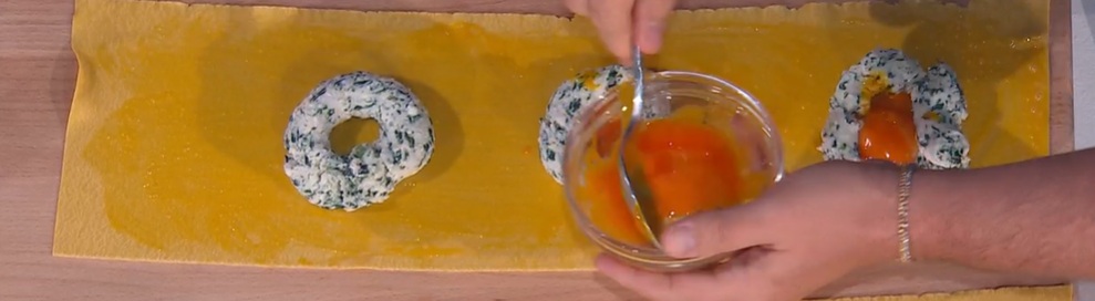 Spennelliamo la sfoglia con i tuorli sbattuti, quindi creiamo sopra come delle ciambelle di ripieno. Al centro di ogni ciambella, mettiamo un tuorlo intero. Copriamo con un’altra sfoglia di pasta, che facciamo ben aderire, facendo uscire l’aria. Ritagliamo i ravioloni con una rotella dentellata, dando la forma di un quadrato.