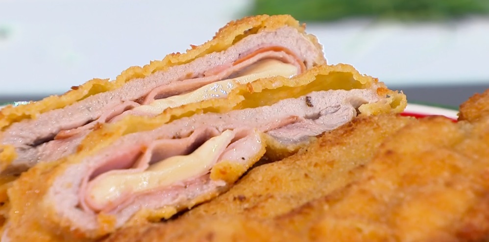 - 4 fette di vitello, 4 fette di edamer, 4 fette di prosciutto affumicato, 2 uova, 60 g burro chiarificato, 100 g farina 00, 200 g pangrattato, sale