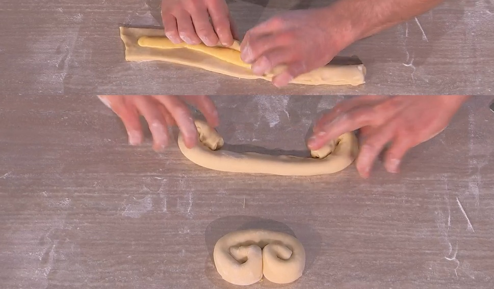 Stendiamo l’impasto sul piano infarinato con il mattarello, in modo da creare un rettangolo spesso solo mezzo cm. Ne ricaviamo delle strisce di circa 30×3-4 cm. Su ognuna, al centro, creiamo un serpentello di crema pasticcera. Ripieghiamo un lembo sulla crema, sigillando bene la giuntura. Diamo la forma di un ventaglio, rigirando le estremità verso il centro (foto).