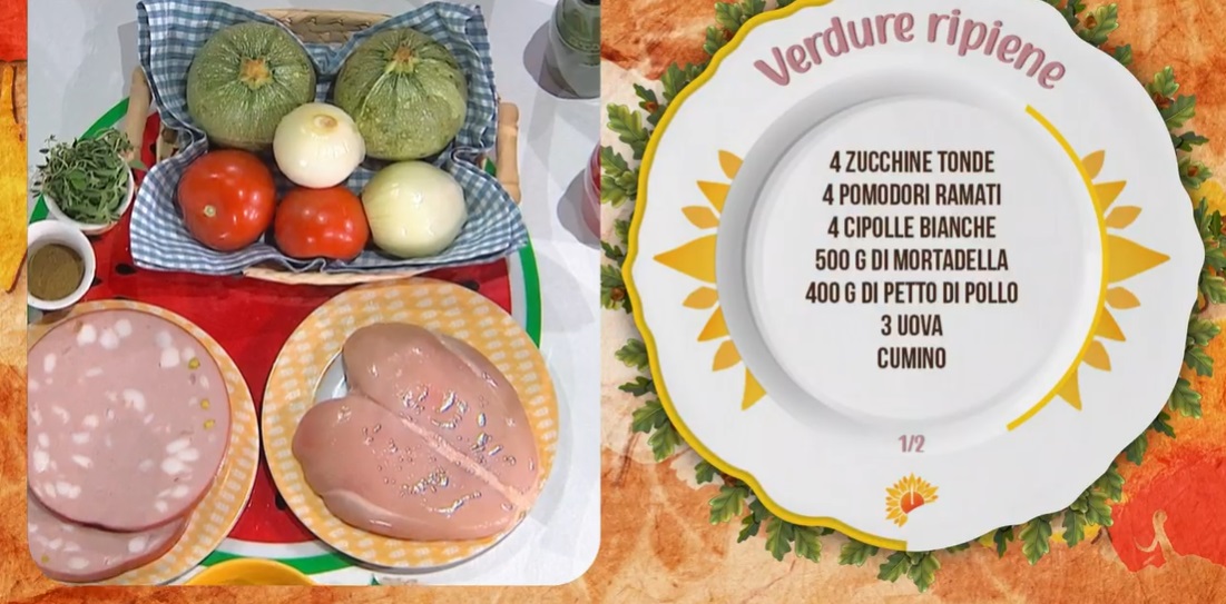 - 4 zucchine tonde, 4 pomodori ramati, 4 cipolle bianche, 500 g mortadella, 400 g petto di pollo, 3 uova, cumino, noce moscata, timo e maggiorana, olio, sale e pepe