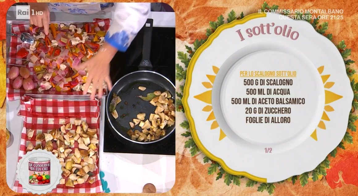 verdure sott'olio di zia CriNon più all’inizio, ma alla fine di ogni puntata, l’infaticabile zia Cri torna a ‘spignattare’ per regalarci qualche idea veloce e golosa per il pranzo o la cena. Oggi, in particolare, la cuoca romagnola ci insegna a preparare le conserve sott’olio.