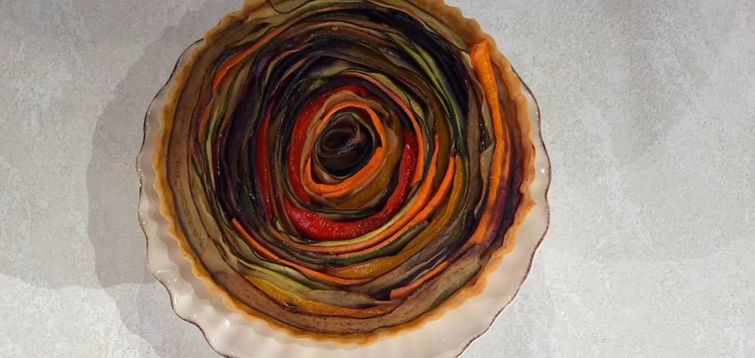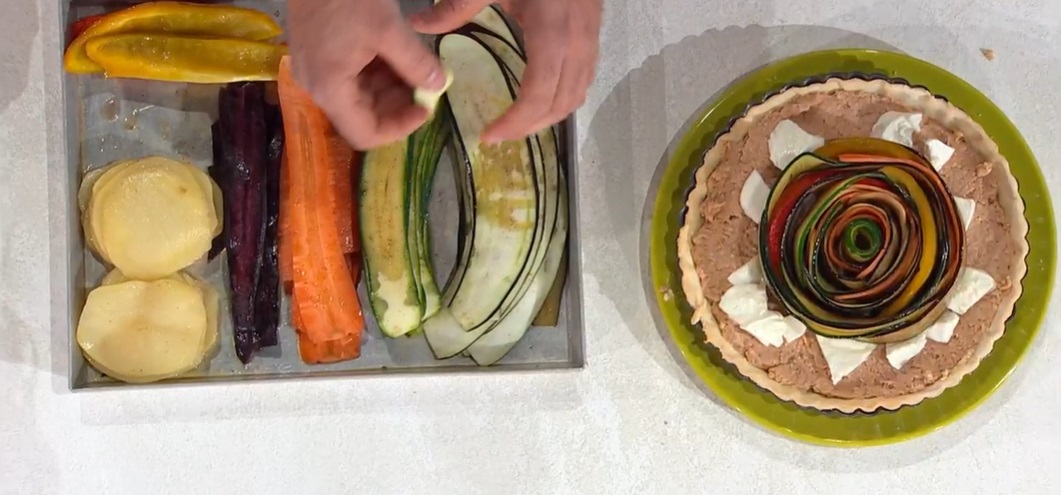 Farciamo la briseè cotta ed ormai fredda con la crema al tonno, mettiamo sopra tutte le verdure, formando una spirale (partiamo dal centro, verso i bordi). Inforniamo ancora a 175⁰ altri 15/20 minuti. Spolveriamo di timo tritato e serviamo.