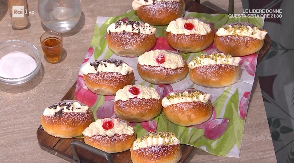 Pratichiamo una taglio profondo al centro, quindi li bagniamo con uno sciroppo di acqua, zucchero e rum e farciamo con la crema (crema pasticcera e panna montata). Decoriamo a piacere.