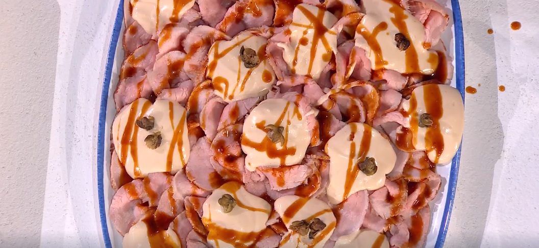 Salsa: nel mixer, mettiamo il tonno sott’olio sgocciolato, l’uovo sodo, salsa al cren, maionese, senape al miele, acciughe, aglio in polvere e frulliamo per bene. David consiglia di aggiungere un po’ del fondo di cottura della carne. Lasciamo riposare in frigorifero.