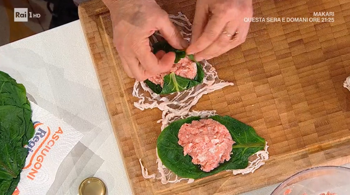 Sul piano, mettiamo un pezzo di rete di maiale, adagiamo sopra una foglia di bietola e finiamo con una polpetta di macinato. Richiudiamo la bietola e la rete sul macinato e sigilliamo per bene. Mettiamo a riposare in frigorifero. Successivamente, mettiamo a rosolare in padella con una foglia di alloro, a fiamma vivace (deve arrivare a 65° al cuore): la rete si scioglierà e gli involtini diventeranno dorati. Sfumiamo con il vino a metà cottura. Quando gli involtini sono cotti, li togliamo ed uniamo al fondo di cottura la senape. Lasciamo addensare qualche istante sul fuoco ed aggiustiamo di sale.