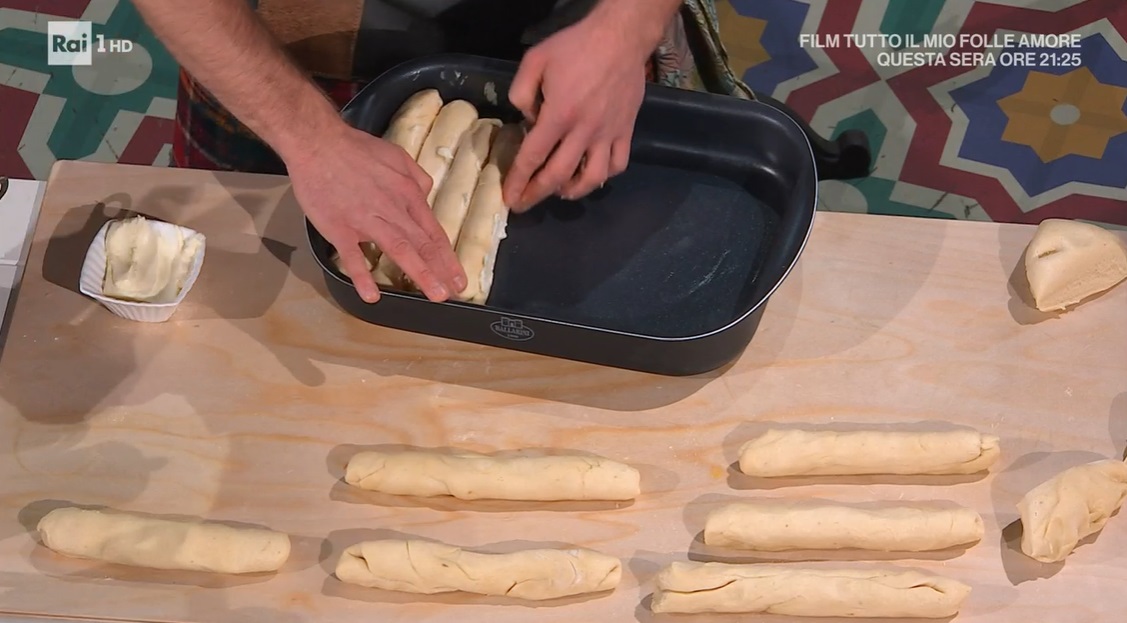 Dividiamo l’impasto in 10 panetti. Allarghiamo ogni panetto sul piano, in modo da formare un quadrato, che arrotoliamo su se stesso ed allunghiamo, in modo da formare dei filoncini lunghi circa 25 cm. Imburriamo una teglia da 25×35 cm. Affianchiamo i filoncini, l’uno all’altro, all’interno della teglia, ben stretti, spalmando i lati di ogni filoncino con il burro morbido. Copriamo e lasciamo lievitare al caldo fino al raddoppio del volume.