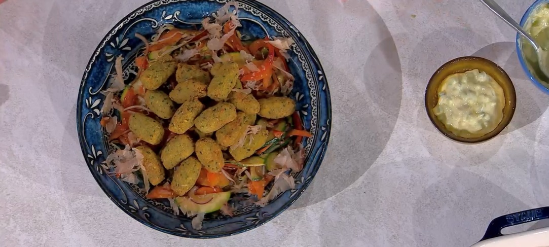 Serviamo le verdure con sopra i falafel e finiamo con la salsa ed il katsuobuschi.