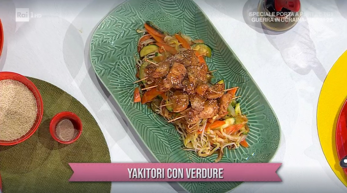 Per il contorno, in una wok, scaldiamo l’olio di semi e mettiamo a soffriggere, a fuoco alto, la cipolla affettata sottilmente, la zucchina a fettine, la carota a listarelle, il cavolo affettato sottilmente. Quasi a fine cottura, uniamo i germogli di soia e l’hondash (dado di pesce) e saltiamo ancora. Infine, saltiamo pochi istanti con la salsa teriyaki.