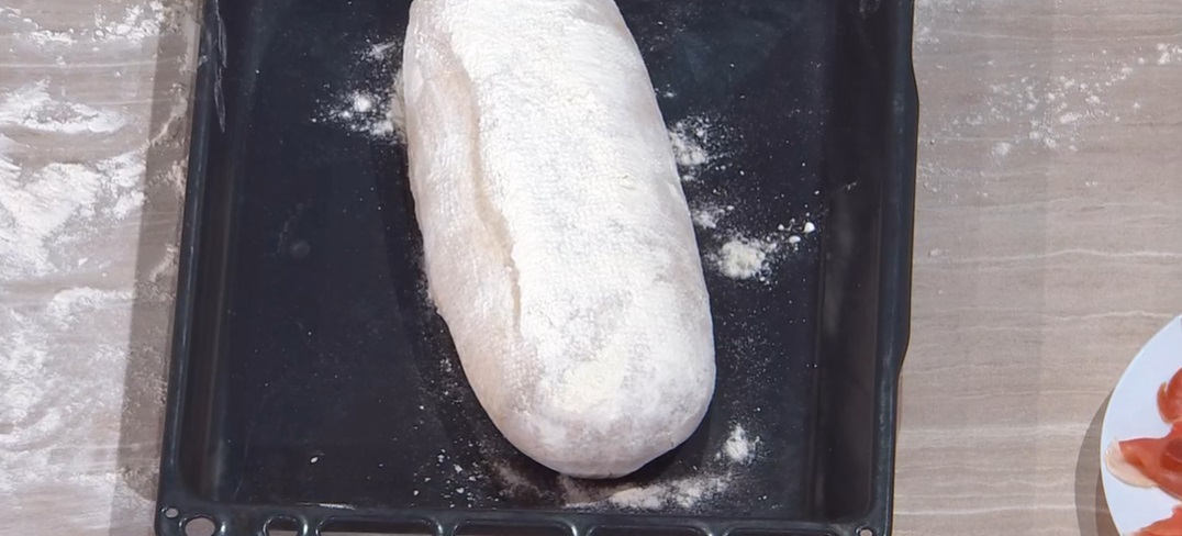 Trasferiamo l’impasto sul piano infarinato, lo allarghiamo, quindi ripieghiamo il rettangolo su se stesso, dal lato lungo, formando un filone. Lo posizioniamo all’interno di uno stampo da plumcake coperto con un canovaccio infarinato (molto infarinato), rivolgendo le pieghe verso l’alto. Copriamo e lasciamo lievitare 3-4 ore a temperatura ambiente.