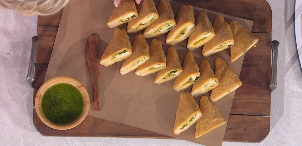 Su una fetta di pancarrè, mettiamo le zucchine grigliate e, sopra, una fetta di mozzarella ben asciutta. Copriamo con una seconda fetta di pane e pressiamo bene sui lati. Tagliamo a metà, in modo da ottenere due triangoli (come fossero tramezzini). Passiamo nella farina, nelle uova sbattute e infine nel pangrattato. Facciamo riposare per mezz’ora in frigorifero, quindi ripassiamo nelle uova e nel pangrattato. Tuffiamo in olio caldo e profondo e lasciamo friggere fino a doratura. Scoliamo su carta assorbente e serviamo calde con la salsa verde.