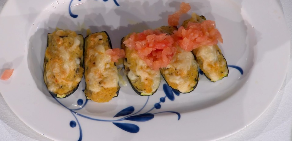Farciamo le barchette di zucchine con il ripieno preparato, spolveriamo la superficie con parmigiano grattugiato e le mettiamo in forno caldo a 180° per 20 minuti.