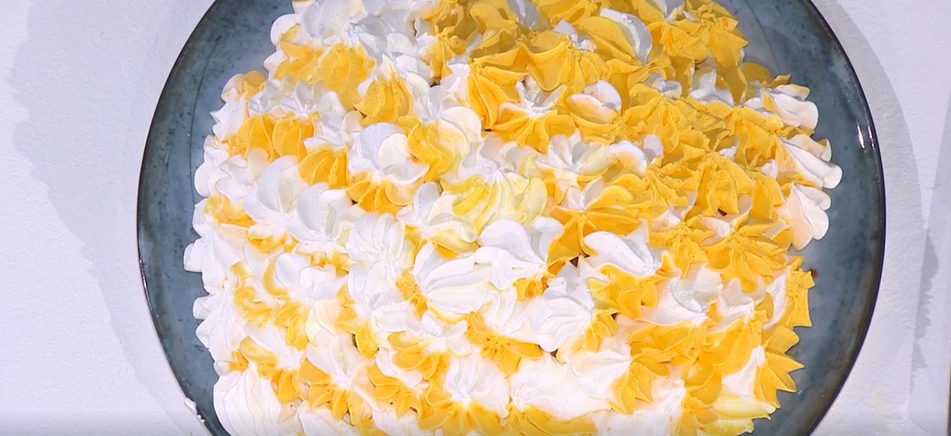 Capovolgiamo lo zuccotto sul piatto da portata e lo copriamo con della panna montata (ne coloriamo una parte con il colorante giallo).