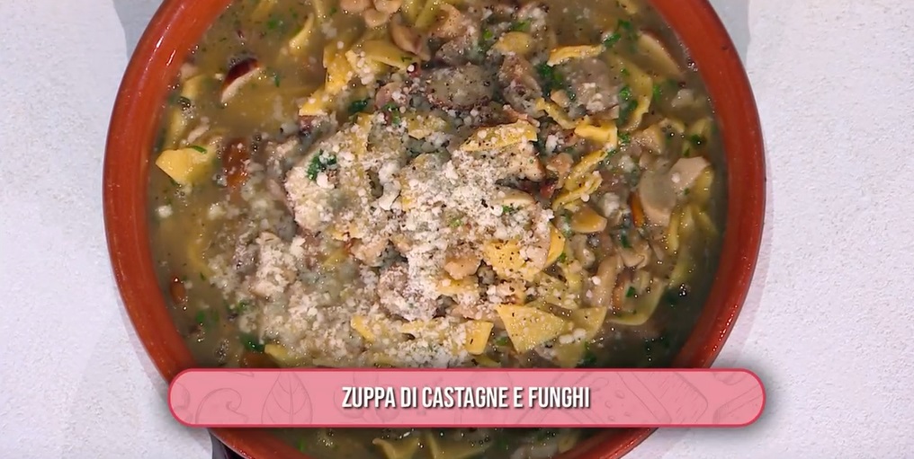 Facciamo rosolare la pancetta tagliata a listarelle in una padella con un goccio di olio. Uniamo uno spicchio di aglio tagliato a metà, i funghi porcini puliti e tagliati a fettine, le castagne precedentemente bollite e sbriciolate (o delle caldarroste avanzate); lasciamo rosolare tutto. Copriamo con il brodo vegetale, mescoliamo e facciamo cuocere qualche minuto, salando solo alla fine.