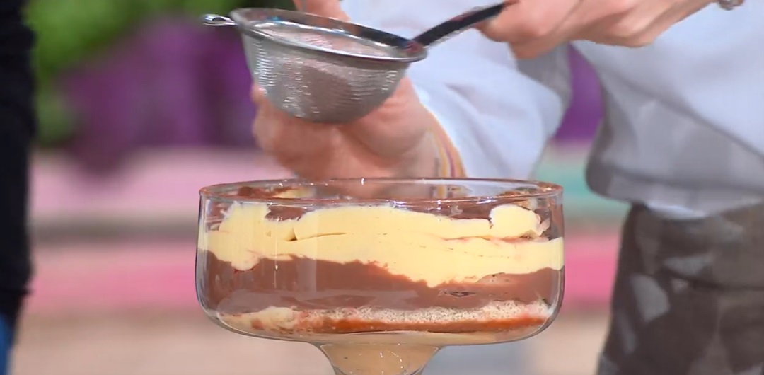 All’interno di una pirofila o una coppa, adagiamo sul fondo un disco di pan di Spagna e lo inzuppiamo con l’alchermes. Spalmiamo sopra uno strato di crema gialla. Proseguiamo con pan di Spagna, bagna e crema al cioccolato. Ripetiamo gli strati, alternando crema gialla e crema al cioccolato. Finiamo con uno strato di crema ed una spolverata di cacao amaro. Lasciamo riposare in frigorifero prima di servire.