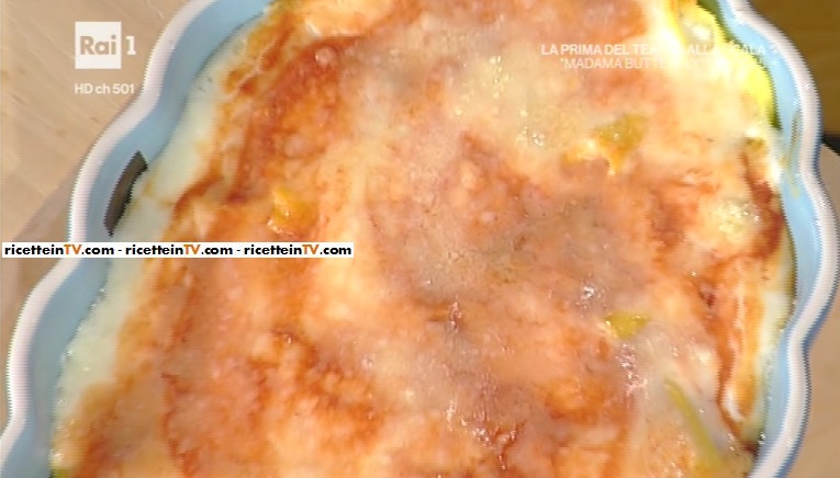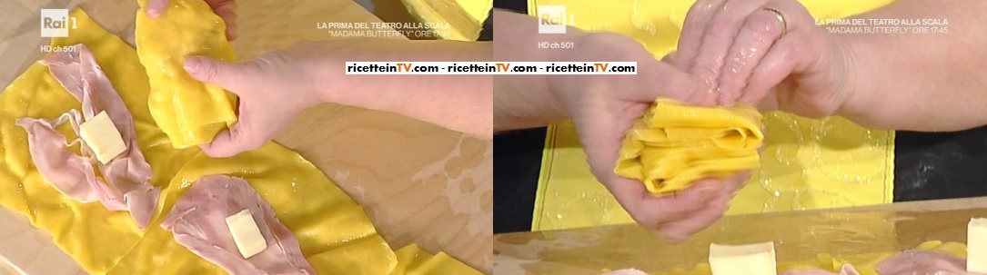 A preparare il primo piatto, quest’oggi, è l’inossidabile Alessandra Spisni. La sfoglina bolognese, che impugna già il suo Luiso, il fidato matterello, prepara i fagottini prosciutto e taleggio gratinati.